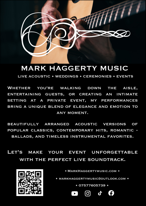 Create unforgettable moments on your wedding day with the sound of live, acoustic guitar. I specialise in solo instrumental performances of your favourite songs, beautifully arranged to add emotion, elegance, and atmosphere throughout your celebration. From guest arrival and your walk down the aisle to signing the register and relaxed background music during drinks and canapés, my music enhances each moment without overpowering it. Every performance is tailored to your story and style, ensuring a truly personal experience. Live guitar brings a warmth and sophistication that recorded music can’t match. Expect elegant acoustic versions of classic favourites, modern hits, romantic ballads, and timeless instrumentals — all carefully crafted for your day. Let your love story be heard through beautiful acoustic music. Get in touch to check availability and discuss your wedding vision.